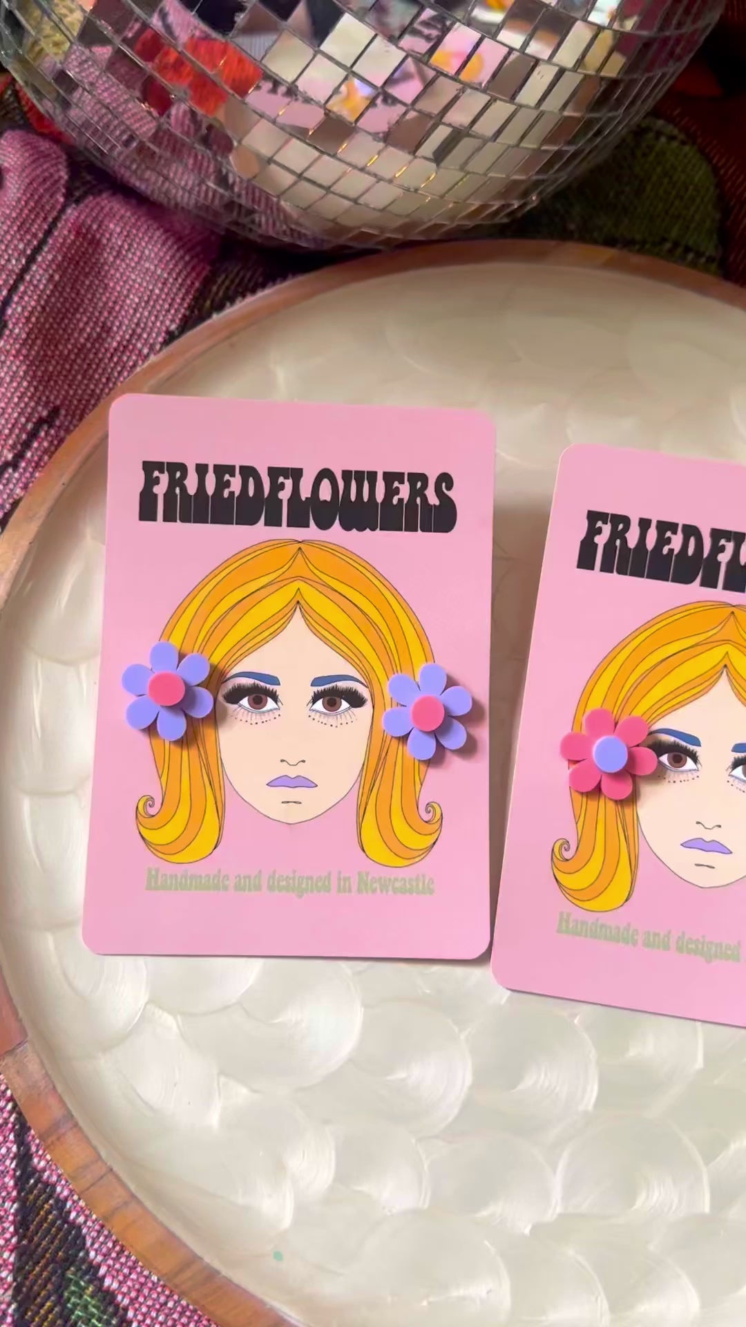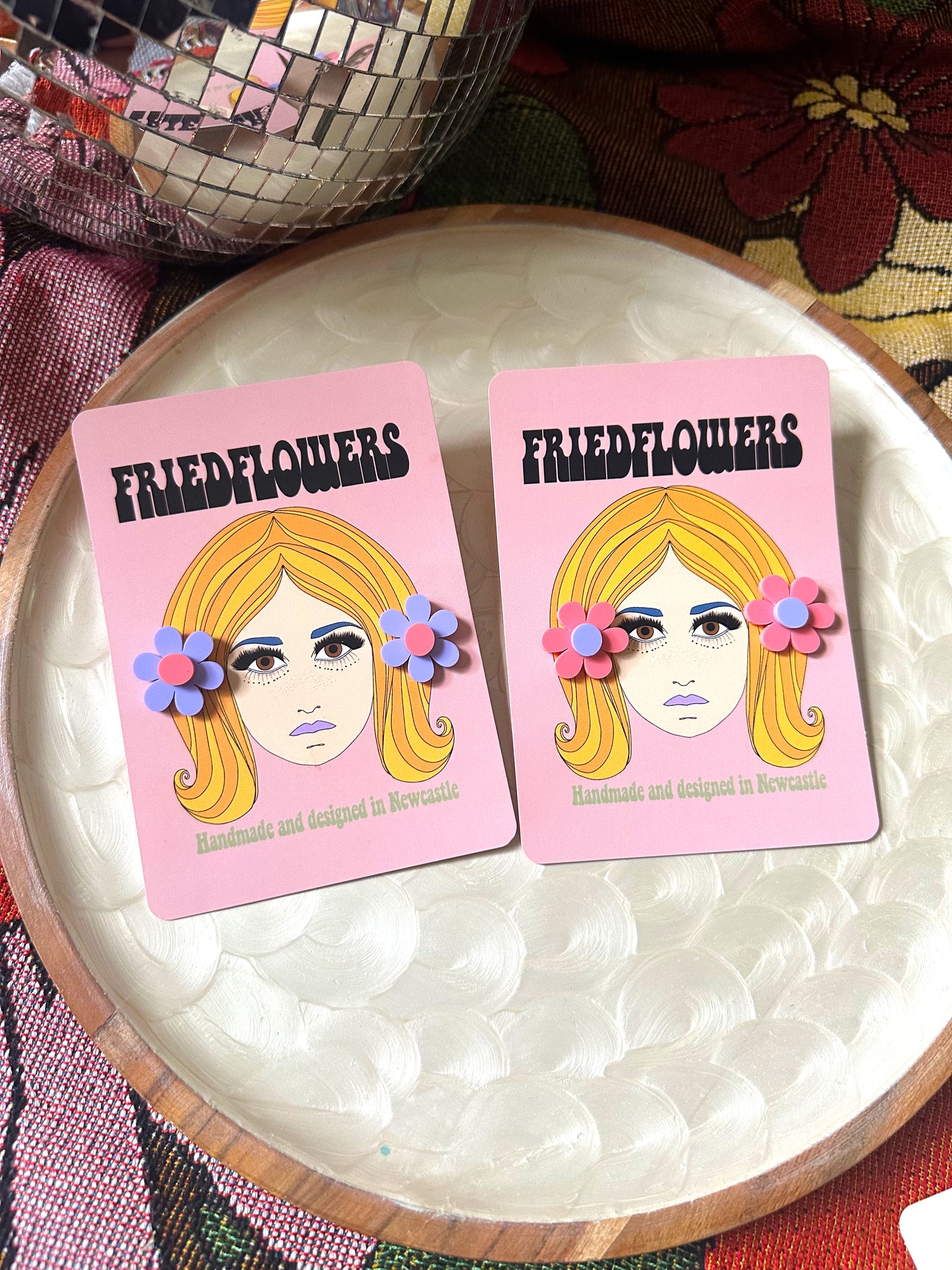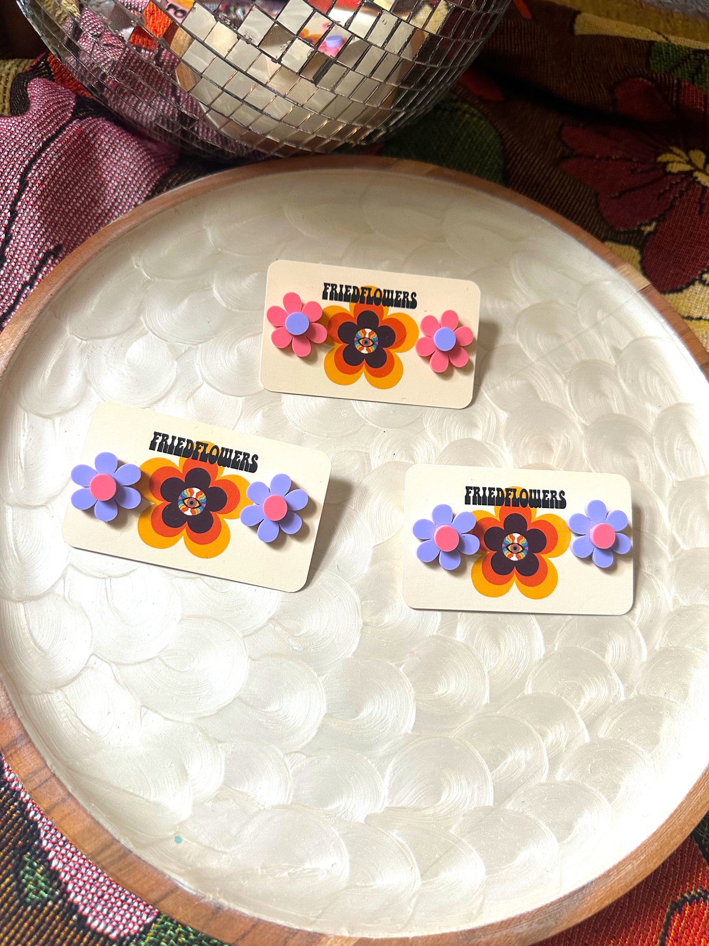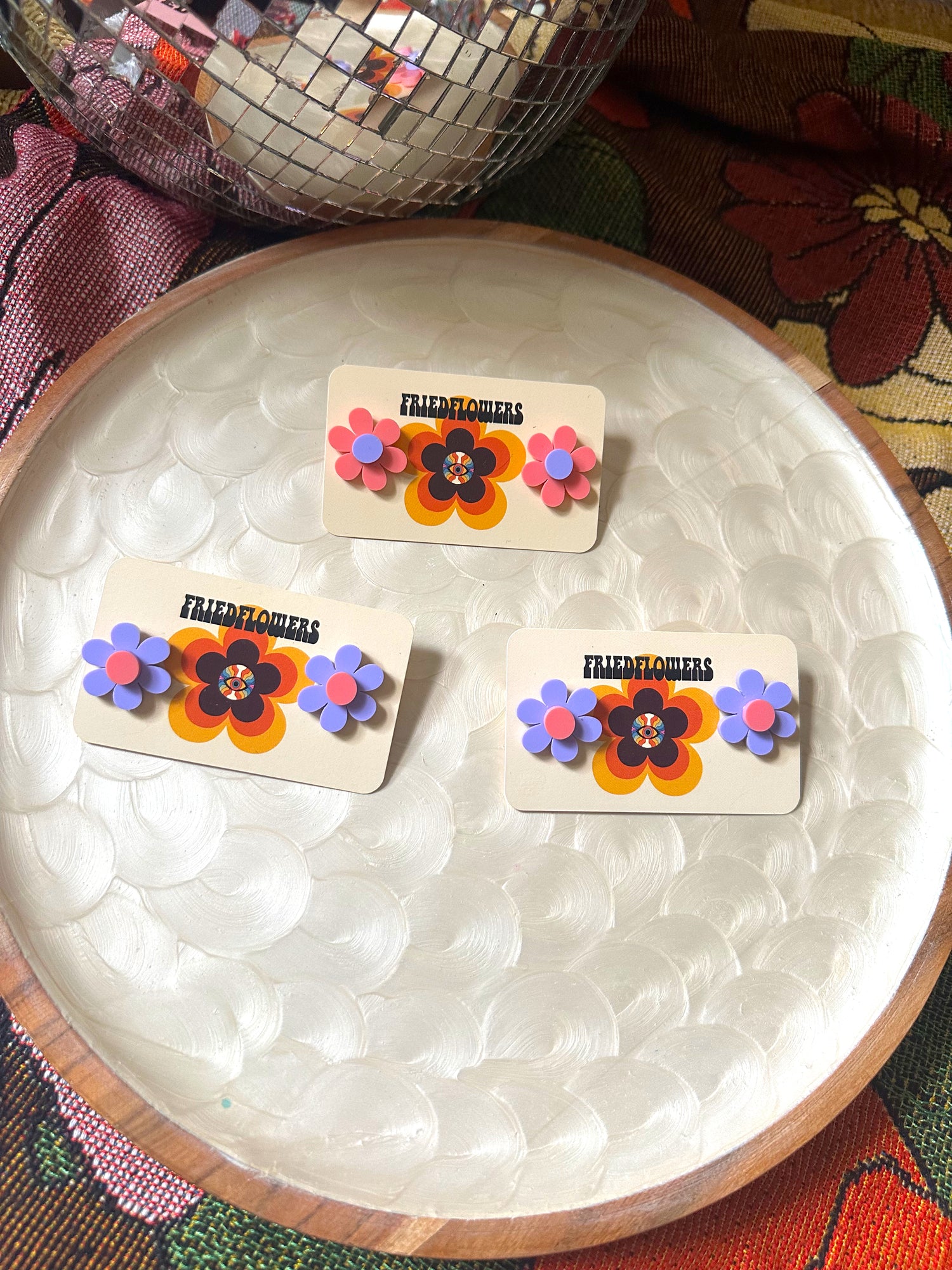 Experience the retro vibes of the 1970s with our popular Cecilia flower dangle earrings, measuring 28mm studs.